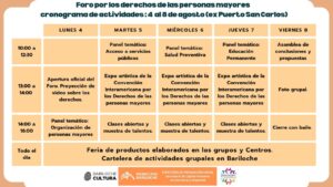 Este martes continúan las actividades con el panel temático sobre acceso a los servicios públicos, exposición artistica sobre la Convención de los Derechos de las personas mayores a cargo de los grupos Ubuntu, Mesa de Personas Mayores del CAAT 2y3, grupos del CAAT 5y6 y Centro de Jubilados/as Cerro El Viejita.