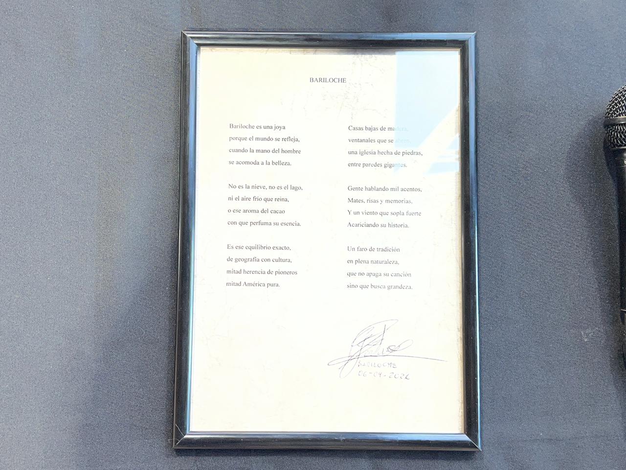 Uno de los momentos más emotivos de la jornada fue la entrega, por parte de Bertino, de una poesía dedicada a Bariloche como reconocimiento a la ciudad y al recibimiento brindado por la Municipalidad y la Subsecretaría de Cultura. El autor agradeció especialmente la posibilidad de realizar en Bariloche esta presentación, incluso antes que en otras ciudades donde también continuará difundiendo su obra.