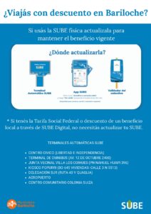La actualización de la tarjeta SUBE puede realizarse en las siguientes terminales automáticas habilitadas en diferentes puntos de la ciudad: Centro Cívico (Libertad e Independencia), Terminal de Ómnibus (Av. 12 de Octubre 2400), Junta Vecinal Villa Los Coihues (PN Nahuel Huapi 396), Kiosco Popurrí (B° 645 Viviendas – Calle 3 N° 5513), Delegación Sur (Ruta 40 y Quaglia), Aeropuerto y Centro Comunitario de Colonia Suiza.