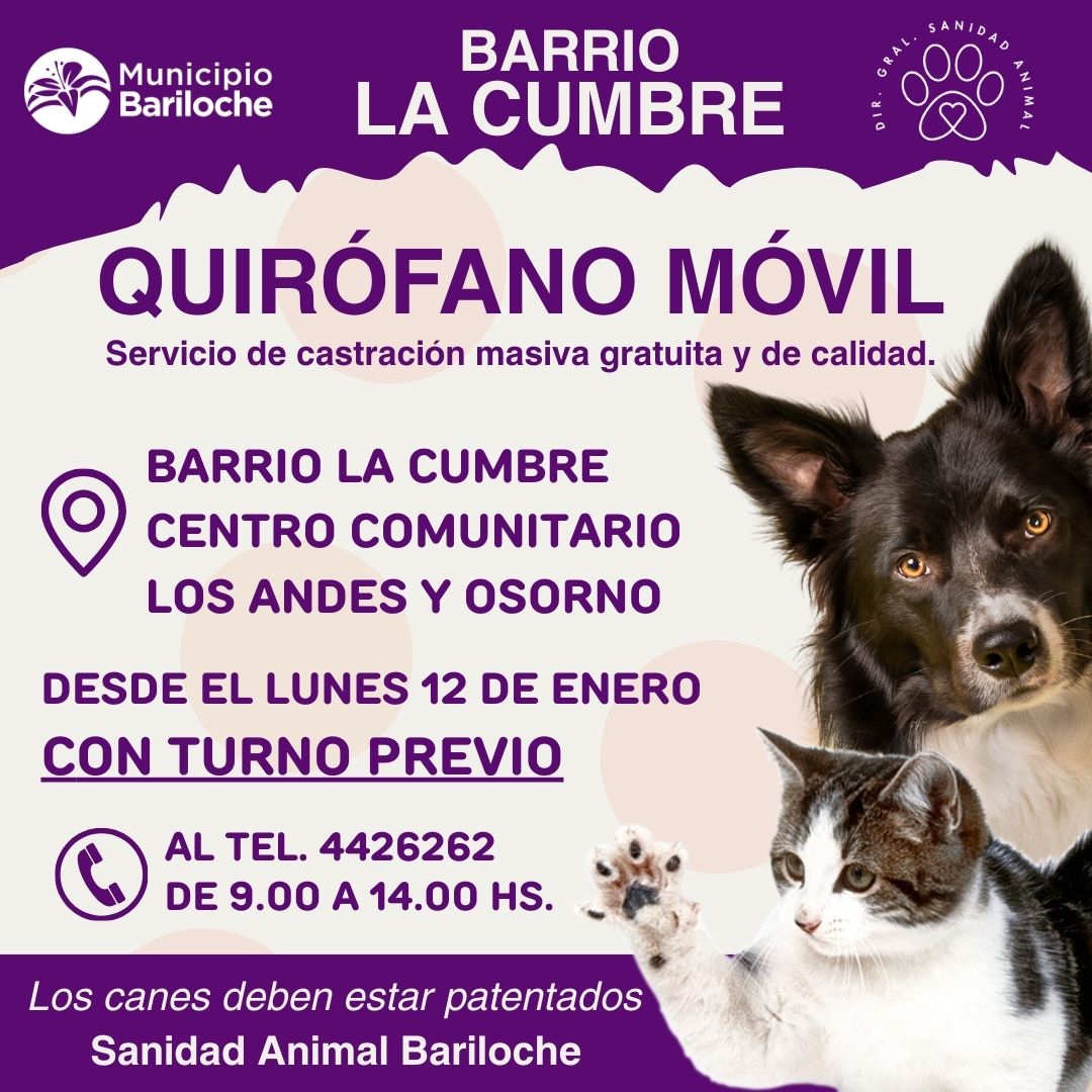 Desde este lunes 12 de enero, el Quirófano Móvil de Sanidad Animal comenzó a funcionar en el barrio La Cumbre, brindando un servicio de castración masiva, gratuita y de calidad para perros y gatos. La atención se desarrolla en el Centro Comunitario, ubicado en la intersección de Los Andes y Osorno, con turnos previamente asignados.