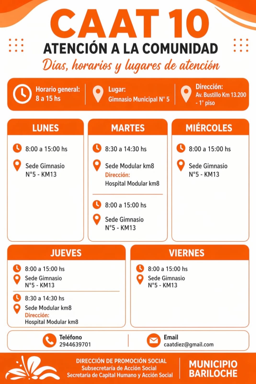 El punto neurálgico de las operaciones continúa siendo el Gimnasio Municipal Nº 5 “Demetrio ‘Chueco’ Velázquez” del km 13, ubicado estratégicamente en la Avenida Bustillo, a la altura del kilómetro 13.200. En este establecimiento, la atención se concentra de manera regular en el primer piso, ofreciendo un espacio de referencia para que los ciudadanos realicen trámites, consultas y reciban asesoramiento integral sobre las políticas sociales vigentes.