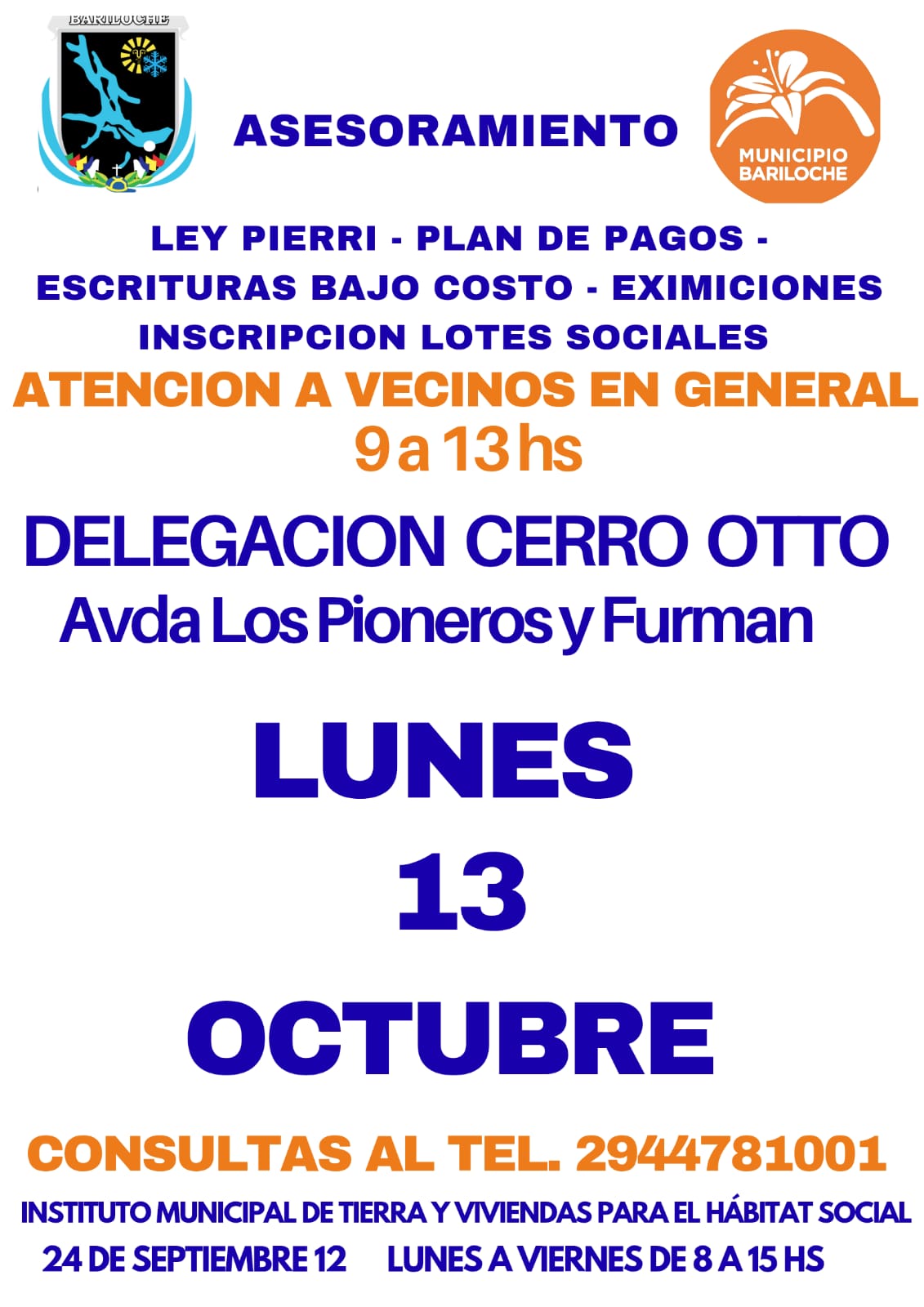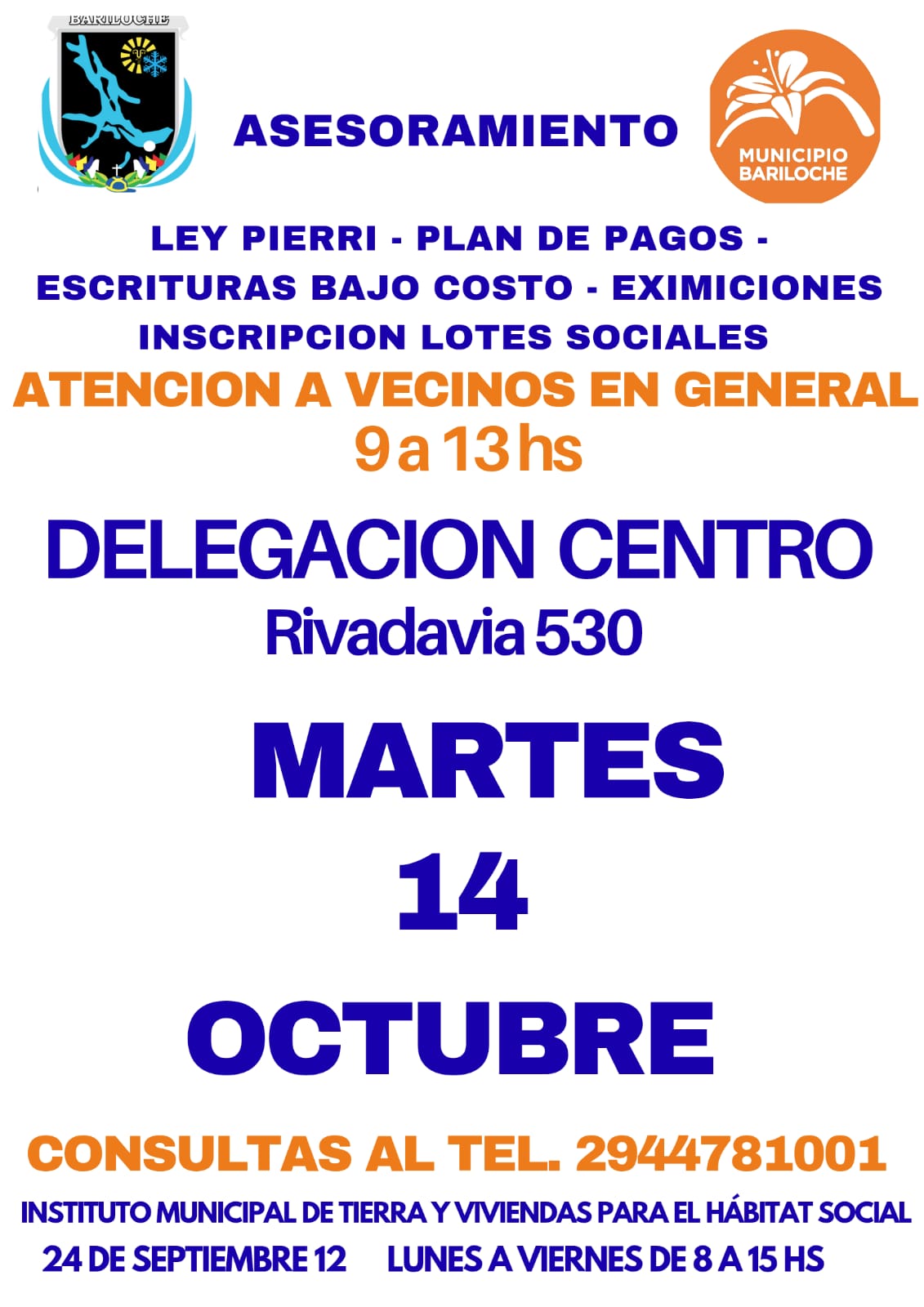El Instituto Municipal de Tierra y Viviendas para el Hábitat Social (IMTVyHS) de San Carlos de Bariloche informa a la comunidad y a los medios de comunicación sobre la puesta en marcha de un nuevo cronograma de asesoramiento itinerante y gratuito en distintas Delegaciones Municipales durante el mes de octubre de 2025.