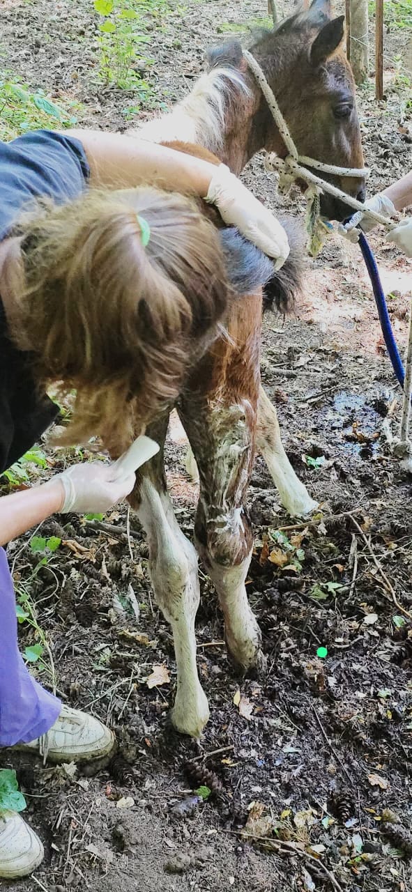 La potranca ingresó con un cuadro clínico de extrema gravedad, caracterizado por debilidad generalizada, heridas activas y una lesión en el miembro posterior derecho que compromete su capacidad de incorporarse y mantenerse en pie. Este conjunto de factores, sumado a su corta edad, configura un pronóstico reservado a grave, que requiere atención veterinaria constante y especializada.