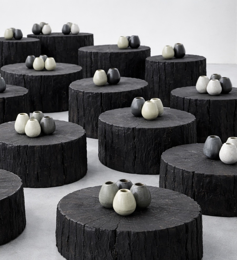 Las vasijas se apropian de un sector del hotel y se disponen sobre pedestales a distintas alturas, configurando un ritmo ondulante que evoca el movimiento del lago. Cada pieza propone un gesto de cuidado y de vínculo afectivo con el agua, apareciendo como pequeñas ofrendas que honran el lago que nos rodea.