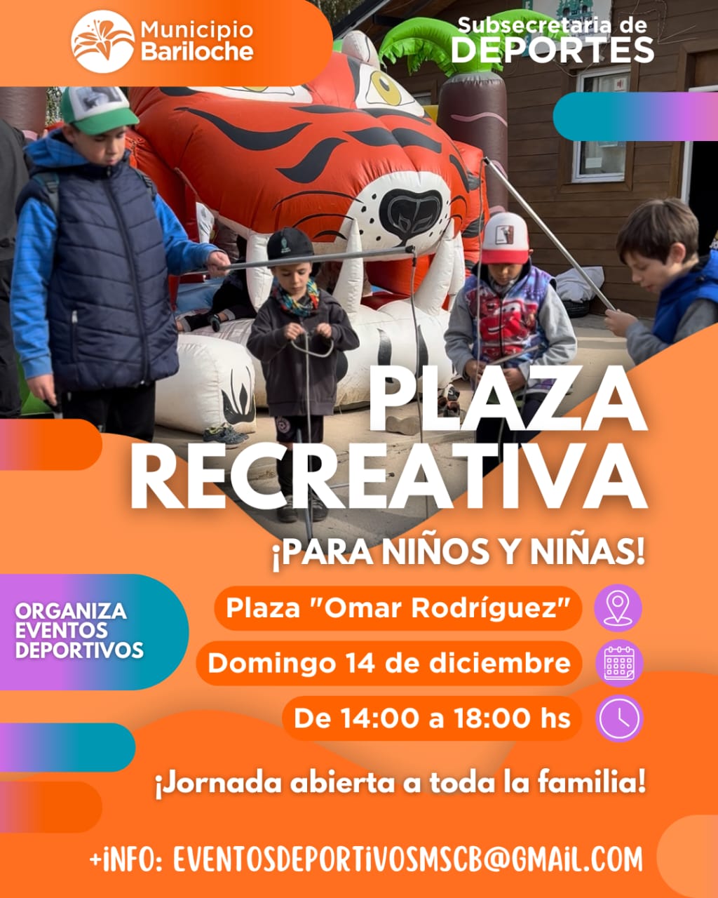 La Municipalidad de San Carlos de Bariloche, a través de su Subsecretaría de Deportes, ha organizado una nueva edición de la “Plaza Recreativa” ubicada en Ruta 40 y Sobral, una jornada dedicada a la diversión y el esparcimiento para toda la familia. La iniciativa busca ofrecer un espacio seguro y alegre donde los más pequeños, y por extensión toda la familia, puedan disfrutar de una tarde de actividades al aire libre y en comunidad.
