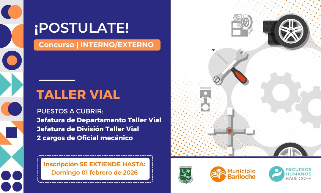 En el marco del Concurso Interno y Externo para cubrir los puestos de Jefatura de Dpto. Taller Vial, Jefatura de División Taller Vial y 2 cargos de Oficial mecánico en el Municipio de Bariloche, se extiende hasta el 1º de febrero la fecha de inscripción.