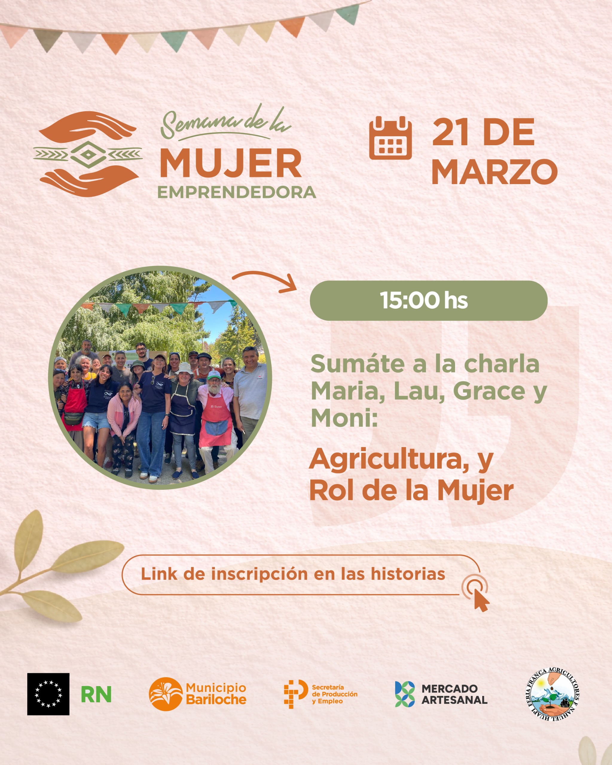 La charla estará a cargo de productoras de la Feria Franca Nahuel Huapi, quienes forman parte del Plan Integral de Comercialización dependiente de la Secretaría de Producción y Empleo. Durante el encuentro compartirán su experiencia en torno a la producción urbana y periurbana, el rol de las mujeres en el desarrollo de estos proyectos y la organización de sus espacios de comercialización.